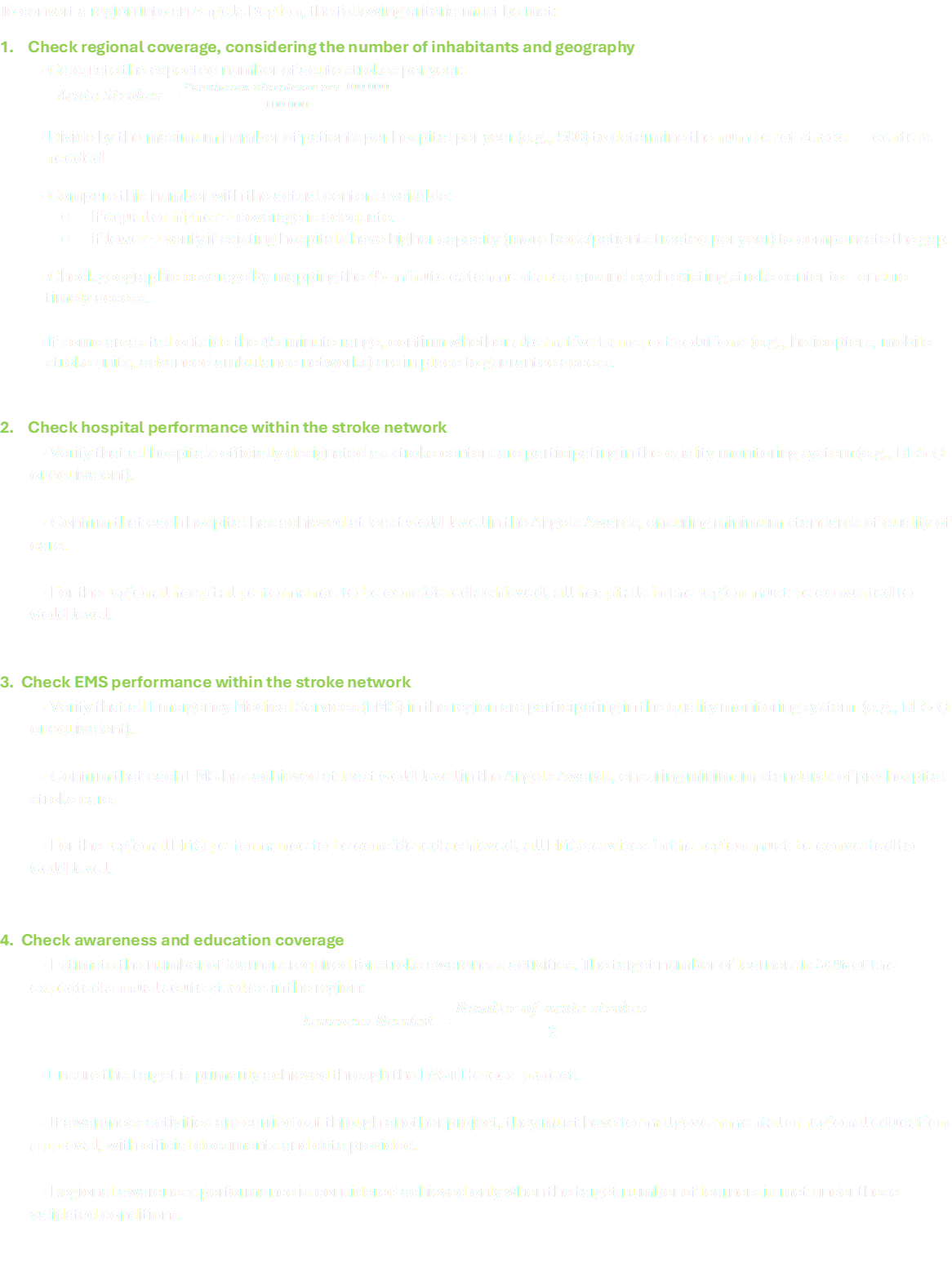 This checklist is designed to support regional leaders in their meetings with consultants to evaluate the readiness of their region for conversion and to set the targets. Each point ensures that population coverage, hospital and EMS performance, and community awareness have been assessed according to the required standards.